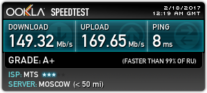 МГТС — далеко не первый провайдер, с которым имею дело, но только у него нашел действительно быструю скорость. 500 мегабит — это то, чего нет у других провайдеров, даже близко. И обходится такая скорость совсем недорого. Спасибо МГТС за огромные возможности в Сети. Выходить в Интернет — одно удовольствие!